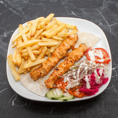 2 brochettes de poulet, frite, crudités, sauce au choix.