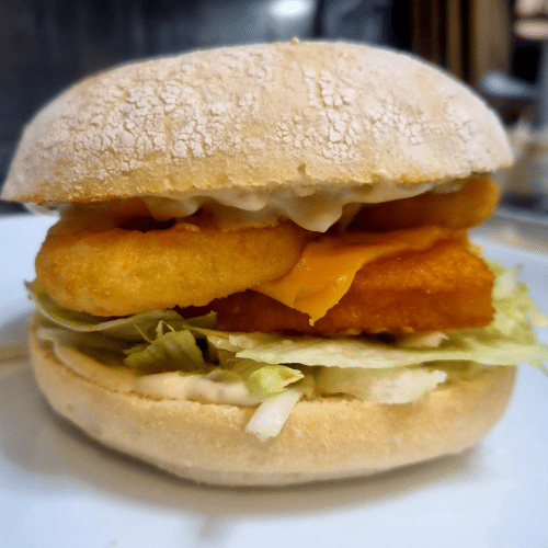 Salade, filet croustillant, oignon rings, oignon sec, cheddar et notre pain bagna.